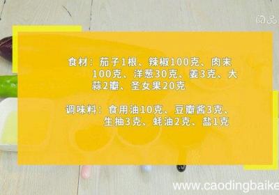 发布时间: 9小时前步骤1食材:茄子1根、辣椒100克、肉末100克、洋葱30克、姜3克、大蒜2瓣、圣女果20克、食用油10克、豆瓣酱3克、生抽3克、蚝油2克、盐1克 。步骤2茄子切丁 。步骤3辣椒切丁 。步骤4洋葱切丁 。步骤5姜切末 。步骤6大蒜切末 。步...