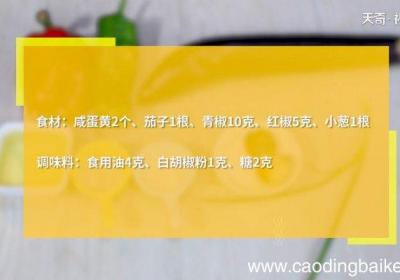 发布时间: 9小时前步骤1准备食材:咸蛋黄2个,茄子1根,青椒10克,红椒5克,小葱1根;调味料:食用油4克,白胡椒粉1克,糖2克 。步骤2茄子切条 。步骤3咸蛋黄压碎 。步骤4加白胡椒粉、糖,拌匀 。步骤5青椒切末 。步骤6红椒切末 。步骤7小葱切葱花 。步...