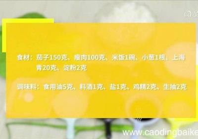 发布时间: 9小时前步骤1食材:茄子150克、瘦肉100克、米饭1碗、小葱1根、上海青20克、淀粉2克 。调味料:食用油5克、料酒1克、盐1克、鸡精2克、生抽2克 。步骤2上海青对半切开,放入沸水锅中焯烫40秒,捞出备用 。步骤3茄子切小丁 。步骤4小葱切葱花...