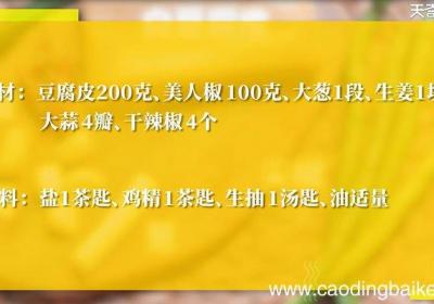 发布时间: 15小时前步骤1所需食材:豆腐皮200克、美人椒100克、大葱1根、生姜1块大蒜4瓣、干辣椒4个 。所需调料:盐1茶匙、鸡精1茶匙、生抽1汤匙 。步骤2白豆皮洗净,对折几次后切条 。步骤3青尖椒去蒂去籽切小段 。步骤4大葱切圈,大蒜切片,干辣椒切段,...