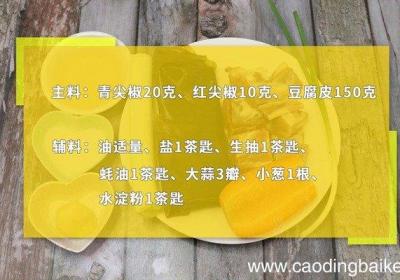 发布时间: 15小时前【尖椒炒豆腐皮怎么做 尖椒炒豆腐皮的做法】步骤1所需食材:青椒150克、豆腐皮1张、大蒜3瓣、生姜1块、干辣椒3个 。所需辅料:盐1茶匙、鸡精1茶匙、油5克 。步骤2豆腐皮加入温水泡软 。步骤3取出切片 。步骤4美人椒斜切成段,姜切末、蒜切...