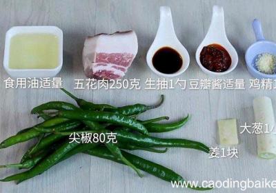 发布时间: 15小时前步骤1食材:尖椒80克、五花肉250克 。辅料:大葱1小段、姜1块、生抽1勺、鸡精1勺、豆瓣酱适量、食用油适量 。步骤2尖椒洗净切成小块 。步骤3姜切丝 。步骤4大葱切片 。步骤5五花肉洗净,切成薄片 。步骤6锅中倒入食用油,放入五花肉,小...