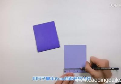 1、取一张紫色和一张浅紫色卡纸,将两张纸分别沿中线对折 。取出其中一张,用尺子量出6cm的距离标注好,再在中间每隔1.5cm标注一个点 。【情人节爱心贺卡 爱心贺卡的做法】2、将标注好的点对应边线画出四条平行线 。在第一条和第三条线上量出6...