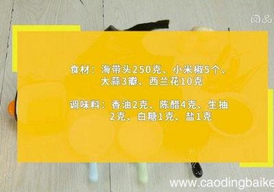 发布时间: 13小时前步骤1食材:海带头250克、小米椒5个、大蒜3瓣、西兰花10克、香油2克、陈醋4克、生抽2克、白糖1克、盐1克 。步骤2海带头温水浸泡30分钟,洗净 。步骤3西兰花放入沸水锅中,煮30秒,捞出备用 。步骤4锅中放入适量清水煮沸,放入海带头煮...