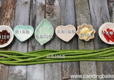 发布时间: 13小时前步骤1主料:豇豆200克 。辅料:盐1茶匙、冰糖20克、白酒1茶匙、蒜3瓣、小米椒10克、花椒10克 。步骤2豇豆洗净切长条 。步骤3蒜切末,小米椒切圈 。锅中倒水烧开,放入花椒、豆角将豆角煮熟捞出控干水分 。步骤4锅中再次烧水,放入盐、花...