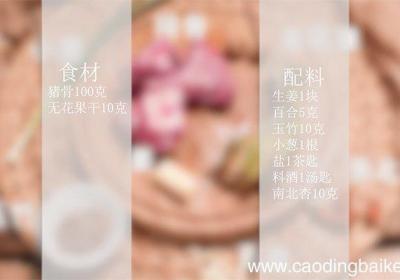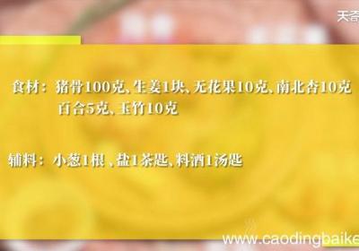 发布时间: 8小时前步骤1准备食材:猪骨100克、生姜1块、无花果干10克、南北杏10克、百合5克、玉竹10克、小葱1根、盐1茶匙、料酒1汤匙 。步骤2先将无花果、玉竹、百合,倒入碗中,用清水提前泡发半小时 。步骤3生姜切碎 。步骤4锅中烧水,水沸后放入猪骨、...