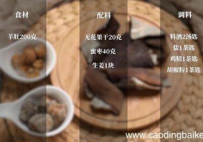 步骤1准备食材:羊肚200克、无花果干20克、蜜枣40克、生姜1块、料酒2汤匙、盐1茶匙、鸡精1茶匙、胡椒粉1茶匙 。步骤2先将羊肚切成小块 。步骤3姜切成片 。【无花果煲羊肚的做法 无花果煲羊肚怎么做】步骤4锅中加入清水烧开,倒入羊肚,加...