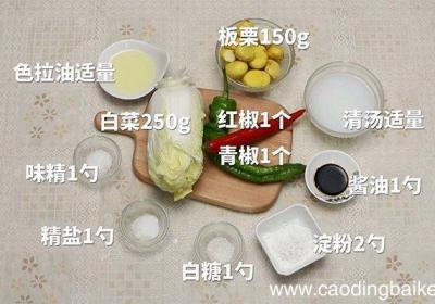 发布时间: 10小时前步骤1准备食材:白菜250克、板栗150克、红椒1个、青椒1个、淀粉2勺、精盐1勺、味精1勺、酱油1勺、白糖1勺、清汤适量、色拉油适量 。步骤2栗子切成两半,放入沸水中煮约10分钟 。步骤3白菜切成1厘米宽、6厘米长的条 。步骤4再放入七成...