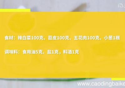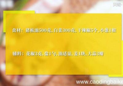 发布时间: 9小时前步骤1食材:猪板油500克、白菜300克、干辣椒5个、小葱1根 。辅料:花椒3克、盐1勺、油适量、姜1块、大蒜3瓣 。步骤2猪板油切片 。步骤3白菜洗净撕成小块 。【肉渣熬白菜的做法 肉渣熬白菜怎么做】步骤4干辣椒切段 。步骤5小葱切葱花...