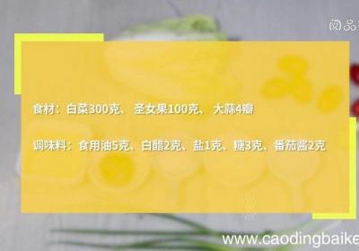 发布时间: 10小时前步骤1食材:白菜300克、 圣女果100克、 大蒜4瓣 。调味料:食用油5克、白醋2克、盐1克、糖3克、番茄酱2克 。步骤2白菜洗净、撕小块 。步骤3圣女果对半切开 。步骤4大蒜切末 。步骤5热锅倒油、油温5成热时、下蒜、炒香、加入圣女果、...