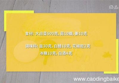发布时间: 9小时前步骤1食材:大白菜500克,蒜10瓣,姜10克 。调味料:盐30克,白醋10克,花椒粒2克,冰糖10克,白酒4克 。步骤2大白菜切块 。步骤3姜拍碎 。步骤4碗中放入大白菜,加入盐,拌匀,腌制60分钟 。步骤5锅中倒入适量纯净水,放入冰糖、...
