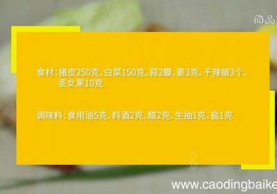 发布时间: 9小时前步骤1食材:猪皮250克、白菜150克、蒜2瓣、姜3克、干辣椒3个、圣女果10克、食用油5克、料酒2克、醋2克、生抽1克、盐1克 。步骤2白菜切块 。步骤3大蒜切末 。步骤4姜切片 。步骤5干辣椒切小段 。步骤6圣女果对半切开 。步骤7猪皮...