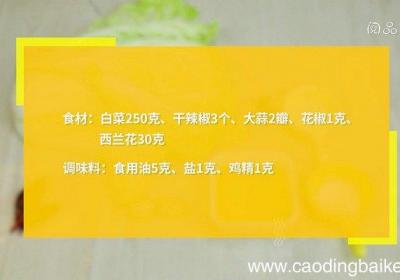 步骤1食材:白菜250克、干辣椒3个、大蒜2瓣、花椒1克、西兰花30克、食用油5克、盐1克、鸡精1克 。步骤2白菜撕成小块 。步骤3干辣椒切段 。步骤4大蒜切片 。【辣糊白菜怎么做 辣糊白菜的做法】 步骤5西兰花择小朵,放入沸水锅中,煮30...