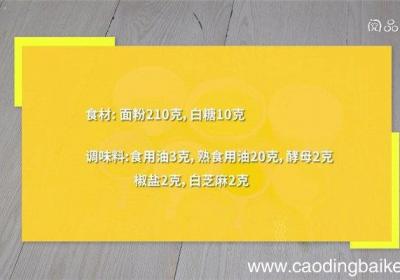 步骤1食材:面粉210克,白糖10克 。调味料:食用油3克,熟食用油20克,酵母2克,椒盐2克,白芝麻2克 。步骤2碗中放入白糖、酵母、100克清水,拌匀 。步骤3筛入200克面粉,和成面团,盖上保鲜膜,醒发至两倍大 。步骤4取小碗,放入熟...