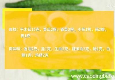发布时间: 10小时前步骤1食材:干木耳15克,黄瓜2根,香菜2根,小葱1根,蒜2瓣,姜1克 。调味料:香油2克,盐1克,生抽2克,辣椒油3克,醋1克,白糖1克,鸡精2克 。步骤2干木耳用温水泡发15分钟,捞出,切小块 。步骤3【木耳拌黄瓜的做法 木耳拌黄瓜怎么...