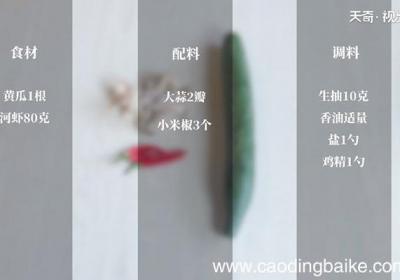 步骤1准备食材:黄瓜1根、河虾80克、大蒜2瓣、小米椒3个、生抽10克、香油适量、盐1勺、鸡精1勺 。步骤2黄瓜洗净去皮 。步骤3除去中间瓜瓤部分,再斜刀切成菱形小块 。步骤4大蒜切末 。步骤5小米椒切圈 。步骤6锅中放入适量水烧开,放入河...