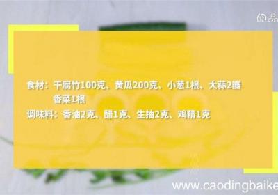 步骤1食材:干腐竹100克、黄瓜200克、小葱1根、大蒜2瓣、香菜1根调味料:香油2克、醋1克、生抽2克、鸡精1克步骤2腐竹用清水泡软,切段,锅中水沸后,煮3分钟,捞出 。步骤3黄瓜拍碎,切小段 。步骤4小葱切葱花 。步骤5大蒜切末 。【凉...