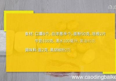 发布时间: 7小时前步骤1食材:口蘑8个、白洋葱半个、面粉50克、培根2片、牛奶100克、清水100毫升、黄油40克 。调味料:盐2克、黑胡椒粉2克 。步骤2口蘑切片 。步骤3白洋葱切丁 。步骤4培根切小片 。步骤5取平底锅开小火,放入20克黄油,融化后,下口...