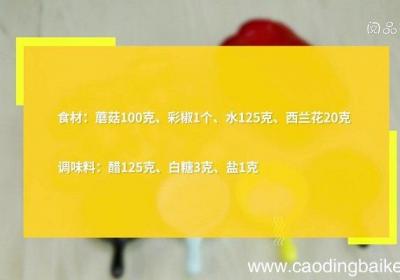 发布时间: 7小时前步骤1食材:蘑菇100克、彩椒1个、水125克、西兰花20克 。调味料:醋125克、白糖3克、盐1克 。步骤2蘑菇切四瓣 。步骤3彩椒切小块 。步骤4西兰花择小朵,放入沸水锅中,煮30秒,捞出备用 。步骤5锅中放入水、醋、白糖、盐,拌匀煮沸...