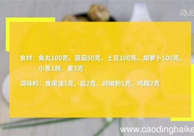 发布时间: 7小时前步骤1食材:鱼丸100克、蘑菇50克、土豆100克、胡萝卜100克、小葱1根、姜3克、食用油5克、盐2克、胡椒粉1克、鸡精2克 。步骤2蘑菇切片 。步骤3土豆去皮,切薄片 。步骤4胡萝卜切薄片 。步骤5小葱切葱花 。步骤6姜切片 。步骤7鱼...