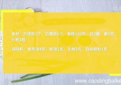 发布时间: 7小时前步骤1食材:方便面1个、白蘑菇5个、香肠100克、蒜2瓣、姜2克、小葱3根调味料:食用油4克、蚝油2克、生抽3克、白胡椒粉1克步骤2白蘑菇切片 。步骤3香肠切片 。步骤4蒜切末 。步骤5姜切末 。步骤6小葱切段 。步骤7方便面用水泡散、捞出...