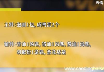 发布时间: 13小时前步骤1所需食材:泡面1包,咸鸭蛋2个 。所需调料:香油1汤匙,猪油1汤匙,酱油1汤匙,胡椒粉1茶匙,葱花适量 。步骤2香油倒入咸蛋黄、猪油拌匀 。步骤3泡面煮软,捞出沥干 。步骤4泡面加入拌好的咸蛋黄 。步骤5再加入胡椒粉、酱油拌匀 。步骤...