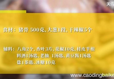 发布时间: 11小时前步骤1食材:猪骨2根、大葱1段、八角2个、香叶3片、花椒10克、干辣椒 5个、桂皮半根 。调料:料酒1汤匙、老抽1汤匙、黄豆酱1汤匙、盐1茶匙、冰糖10克 。步骤2猪棒骨对半剁开 。步骤3冷水下锅 。步骤4加料酒,水开后煮3分钟,捞出沥干,...
