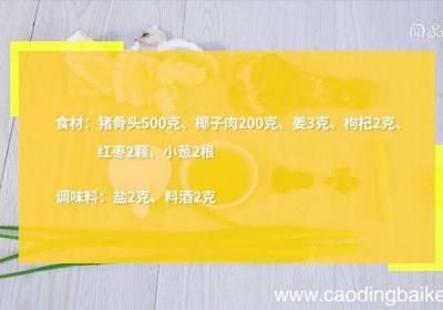 发布时间: 11小时前步骤1食材:猪骨头500克,椰子肉200克,姜3克,枸杞2克,红枣2颗,小葱2根调味料:盐2克,料酒2克步骤2椰子肉切条 。步骤3姜切片 。步骤4【椰子炖骨头汤 椰子炖骨头汤怎么做】小葱切葱花 。步骤5清水中放入料酒、猪骨头,煮10分钟,捞...
