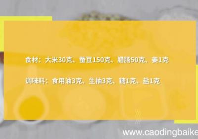 发布时间: 12小时前步骤1准备食材:大米30克、蚕豆150克、腊肠50克、姜1克、食用油3克、生抽3克、糖1克、盐1克 。步骤2蚕豆去皮、洗净沥干备用 。步骤3大米淘洗干净备用 。步骤4姜切末 。步骤5腊肠切片 。步骤6热锅倒油、油温5成热、下姜、腊肠、煸炒出...