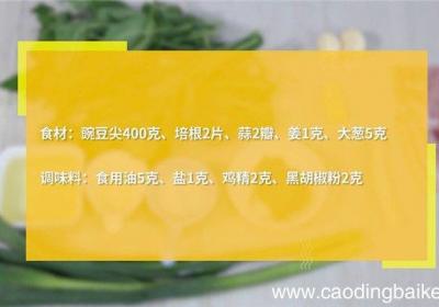 发布时间: 12小时前步骤1食材:豌豆尖400克、培根2片、蒜2瓣、姜1克、大葱5克调味料:食用油5克、盐1克、鸡精2克、黑胡椒粉2克【培根炒豌豆尖的做法 培根炒豌豆尖怎么做】步骤2蒜切片 。步骤3姜切末 。步骤4大葱切片 。步骤5培根切小块 。步骤6豌豆尖洗净...