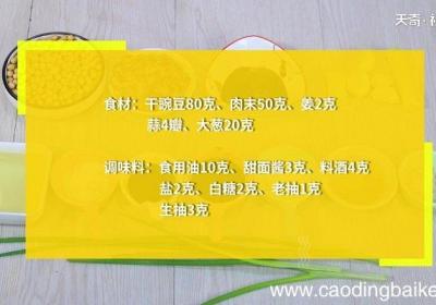 发布时间: 12小时前步骤1食材:干豌豆80克、肉末50 克、姜2克、蒜4瓣、大葱20克调味料:食用油10 克、甜面酱3克、料酒4克、盐2克、白糖2克、老抽1克、生抽3克步骤2干豌豆用清水浸泡24小时 。步骤3姜切末,蒜切末,大葱切末 。步骤4热锅倒油,油温6成...