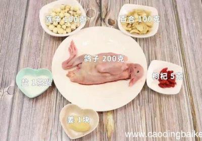 发布时间: 14小时前步骤1准备食材:鸽子200克、莲子100克、百合100克、姜1块、枸杞5克 。步骤2鸽子洗净剁块 。步骤3姜切片 。步骤4莲子浸泡30分钟 。步骤5锅中烧热水,放入鸽子焯水2分钟,捞出备用 。步骤6砂锅中放入鸽子、姜、莲子加适量清水,大火烧...