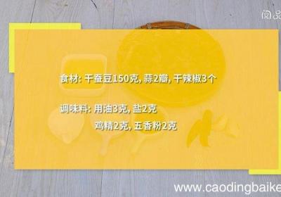 发布时间: 14小时前步骤1食材:干蚕豆150克,蒜2瓣,干辣椒3个 。调味料:食用油3克,盐2克,鸡精2克,五香粉2克 。步骤2干蚕豆用温水浸泡30分钟,捞出沥干 。步骤3蒜切末步骤4干辣椒切段 。步骤5热锅倒油,油温5成热时,下蚕豆,炒2分钟,放蒜、干辣椒,...