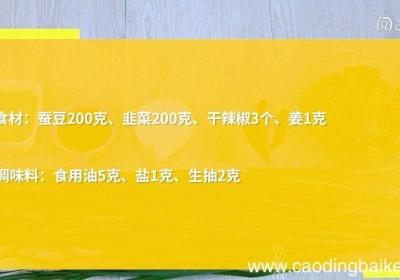 发布时间: 14小时前步骤1食材:蚕豆200克、韭菜200克、干辣椒3个、姜1克 。调味料:食用油5克、盐1克、生抽2克 。步骤2韭菜切段 。步骤3干辣椒切段 。步骤4姜切末 。步骤52.锅中水沸后,加入蚕豆,煮10分钟,捞出 。步骤6热锅倒油,油温5成热时,下...
