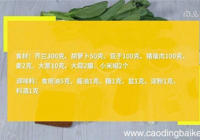 发布时间: 9小时前步骤1食材:芥兰300克、胡萝卜50克、豆干100克、猪廋肉100克、姜2克、大葱10克、大蒜2瓣、小米椒2个调味料:食用油5克、酱油1克、糖1克、盐1克、淀粉1克、料酒1克步骤2芥兰摘去叶子 。步骤3切片 。步骤4猪瘦肉切片 。步骤5加入...