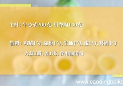 发布时间: 9小时前步骤1主料:牛心菜200克、里脊肉150克 。辅料:鸡精1勺、淀粉1勺、生抽1勺、盐1勺、料酒1勺、大蒜3瓣、姜1块、食用油适量 。步骤2里脊肉切薄片,放入料酒1勺、生抽1勺、淀粉1勺拌匀,腌制10分钟 。步骤3牛心菜撕成小块 。步骤4姜切...