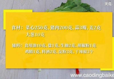 发布时间: 9小时前步骤1食材:菜心250克,猪肉200克,蒜3瓣,姜2克,大葱10克调味料:食用油10克,盐1克,生抽2克,胡椒粉1克,鸡精1克,料酒2克,淀粉3克,干辣椒3个步骤2菜心切片 。步骤3蒜切片 。步骤4姜切片 。步骤5大葱切片 。步骤6干辣椒切...