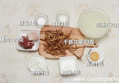发布时间: 9小时前步骤1准备食材:干黄花菜30克、猪肉100克、葱丝5克、淀粉4匙、精盐1匙、味精1匙、香油1匙、鸡汤750克 。步骤2将干黄花菜用清水泡发,去根、洗净 。步骤3沥干水分切成长段 。步骤4猪肉切片,放入碗中 。步骤5加入水淀粉拌匀 。步骤6锅...