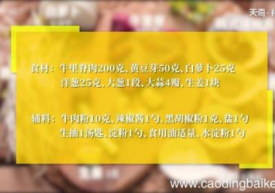 发布时间: 11小时前步骤1所需食材:牛里脊肉100克,黄豆芽50克,白萝卜14个,洋葱14个,生姜2片,大葱1根,大蒜4瓣 。所需调料:牛肉粉10克,韩式辣椒酱1汤匙,黑胡椒粉1克,盐1茶匙,生抽1汤匙,淀粉1汤匙,油5克 。步骤2牛肉洗净切片,加入生抽、水淀...