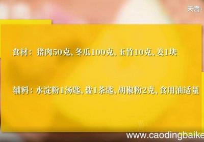发布时间: 11小时前步骤1食材:猪肉50克、冬瓜100克、玉竹10克、姜1块 。调料:水淀粉1汤匙、盐1茶匙、胡椒粉2克、食用油适量 。步骤2冬瓜切片 。步骤3瘦肉切片 。步骤4姜切片 。步骤5瘦肉加入盐、胡椒粉、水淀粉,搅拌均匀 。【玉竹冬瓜瘦肉汤的做法 玉...