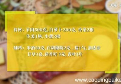 发布时间: 11小时前步骤1食材:羊肉500克、白萝卜200克、香菜2根、生姜1块、小葱3根 。辅料:米酒50克、白胡椒粉2克、盐1勺、油适量、甘草3克、茴香籽3克、香叶3片 。步骤2羊肉切块,放入清水中浸泡1小时 。步骤3白萝卜去皮后切块.步骤4姜切片 。步骤...
