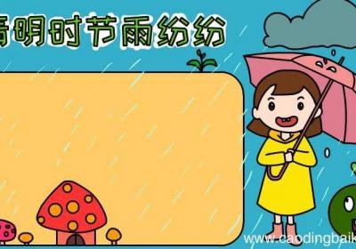 发布时间: 7小时前1、写上【清明时节雨纷纷】,下面画一位撑着伞的小女孩 。2、左边画一个边框,下面画出小蘑菇 。右边画上雨滴和云朵 。3、最后涂上颜色就可以了 。【清明时节雨纷纷手抄报怎么画】...
