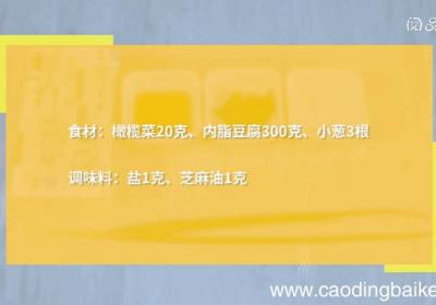 发布时间: 14小时前步骤1【橄榄菜拌豆腐做法橄榄菜拌豆腐怎么做】准备食材:橄榄菜20克,内脂豆腐300克,小葱3根调味料:盐1克,芝麻油1克 。步骤2取出内脂豆腐整块放入大碗中 。步骤3加入开水没过豆腐,烫10分钟,使豆腐匀均受热 。步骤4小葱切段 。步骤5将...