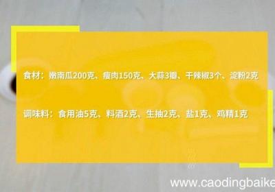 发布时间: 12小时前步骤1食材:嫩南瓜200克、瘦肉150克、大蒜3瓣、干辣椒3个、淀粉2克、食用油5克、料酒2克、生抽2克、盐1克、鸡精1克 。步骤2嫩南瓜切丝 。步骤3大蒜切粒 。步骤4干辣椒切小段 。步骤5瘦肉切丝步骤6加入料酒、少许盐、淀粉,拌匀腌制1...