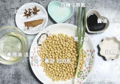 发布时间: 13小时前步骤1准备食材:黄豆200克、八角2个、桂皮1块、酱油1汤匙、白糖1茶匙、葱1根、味精1茶匙、食用油适量 。步骤2先将黄豆放入炒锅中炒香 。步骤3再放入冷水中浸泡2个小时,至豆粒涨大、皮起皱,倒出沥干 。步骤4锅内放适量食用油,烧热,放入黄...