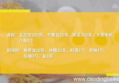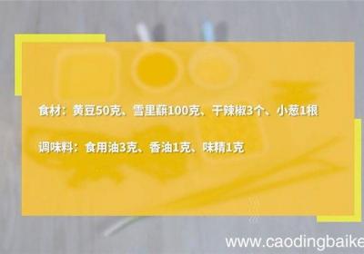步骤1准备食材:黄豆100克、雪里蕻100克、干辣椒3个、花椒1克、小葱2根、姜3片、八角1个、食用油5克 。步骤2黄豆提前泡发,泡发后捞出放锅里,加水没过黄豆,放入一片生姜、一个八角煮20分钟捞出备用 。【雪里蕻炒黄豆做法雪里蕻炒黄豆怎么...