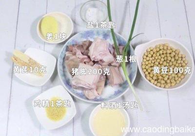 发布时间: 12小时前步骤1准备食材:猪脚200克、黄豆100克、黄芪10克、姜1块、葱1根、盐1茶匙、鸡精1茶匙、料酒1汤匙 。步骤2猪脚洗净备用 。步骤3姜切片 。步骤4葱打成结 。步骤5锅中烧热水放入猪脚焯水2分钟 。步骤6砂锅中加入黄豆、葱、姜片、料酒,...