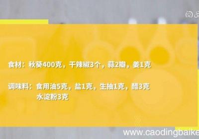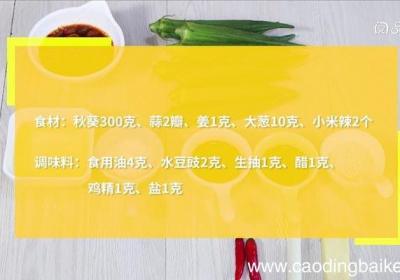 发布时间: 8小时前步骤1食材:秋葵400克,干辣椒3个,蒜2瓣,姜1克 。调味料:食用油5克,盐1克,生抽1克,鸡精1个,醋3克,糖1克,水淀粉3克 。步骤2秋葵洗净,去蒂,切圈 。步骤3干辣椒剪圈 。步骤4蒜切末 。步骤5姜切末 。步骤6热锅倒油,油温5成...