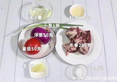 发布时间: 15小时前步骤1准备食材:牛骨200克、番茄50克、洋葱50克、盐1茶匙、料酒1茶匙、小葱1根、姜1块、油适量 。步骤2牛骨提前让老板剁成小块,洗净备用 。步骤3番茄切块 。步骤4洋葱切块 。步骤5姜切片 。步骤6葱切葱花 。步骤7起锅烧水,将牛骨放...