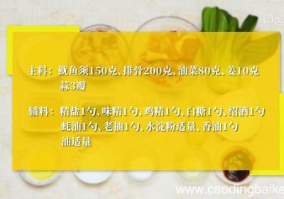 发布时间: 15小时前步骤1准备食材:鱿鱼须150克、排骨200克、油菜80克、姜10克、蒜3瓣、精盐1勺、味精1勺、鸡精1勺、白糖1勺、绍酒1勺、蚝油1勺、老抽1勺、水淀粉适量、香油1勺、油适量 。步骤2姜切片 。步骤3蒜切片 。步骤4鱿鱼须切条备用 。步骤5...